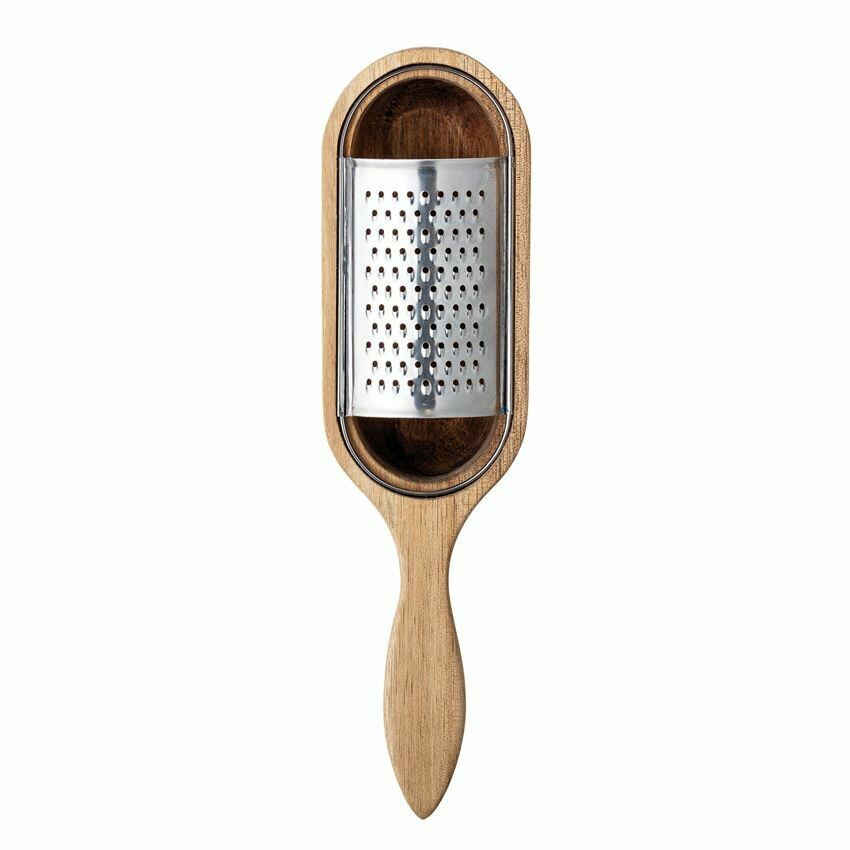 This grater sits over a bowl shaped scoop for catching the cut pieces. It also has a convenient handle for holding the grater in place while working. When the scoop becomes full, lift off the metal grater and empty the scoop.